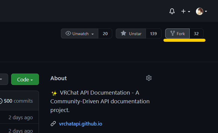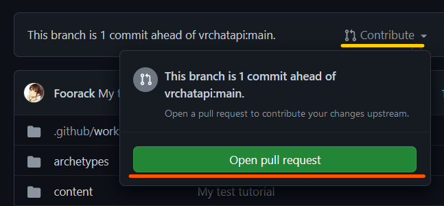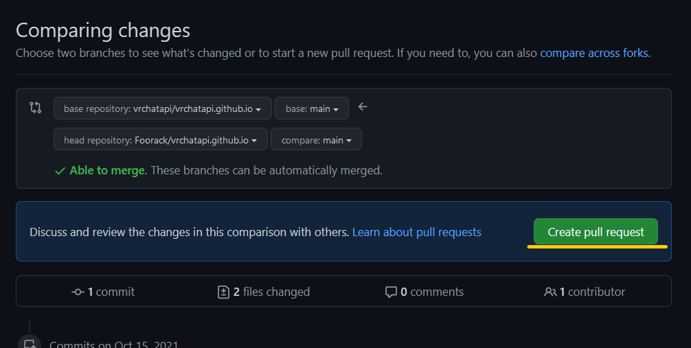 Finally we need to go to the the fork at https://github.com/YOUR_USERNAME/vrchatapi.github.io and click “Contribute” > “Open Pull Request”.