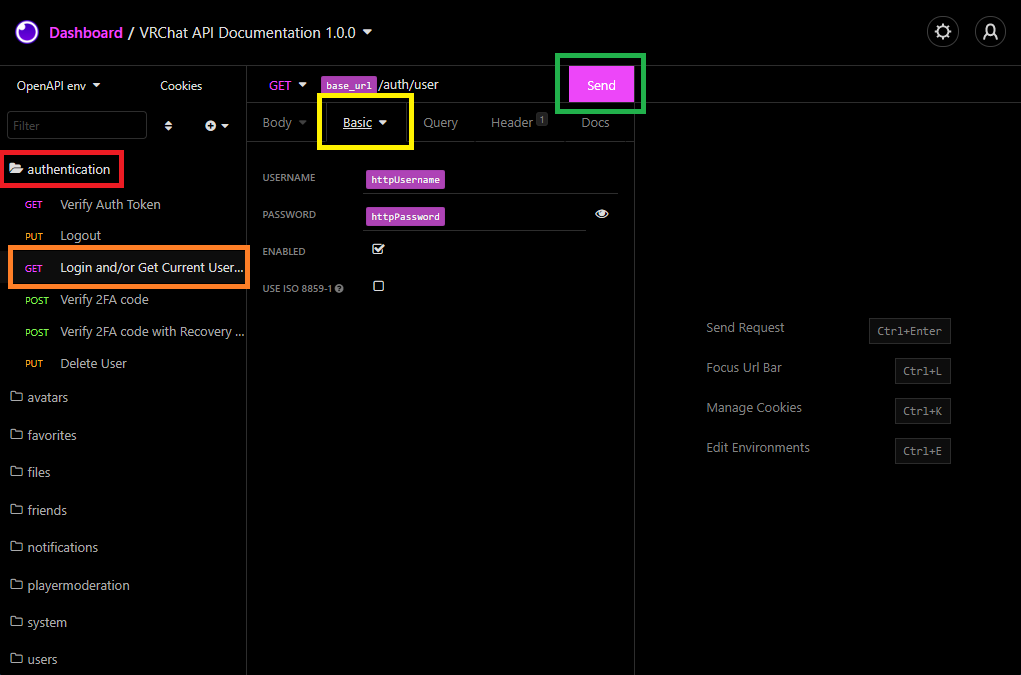 Go to Authenticate, as being logged in is required for most requests. Click the “authentication” folder on the left, locate the endpoint “Login and/or Get Current User Info”. In VRChat the same endpoint is used for authentication as getting your own user information. If you are not logged in then it will generate an authtoken cookie for you and return your user info. If you already are logged in then nothing will happen and it will only return your user info.